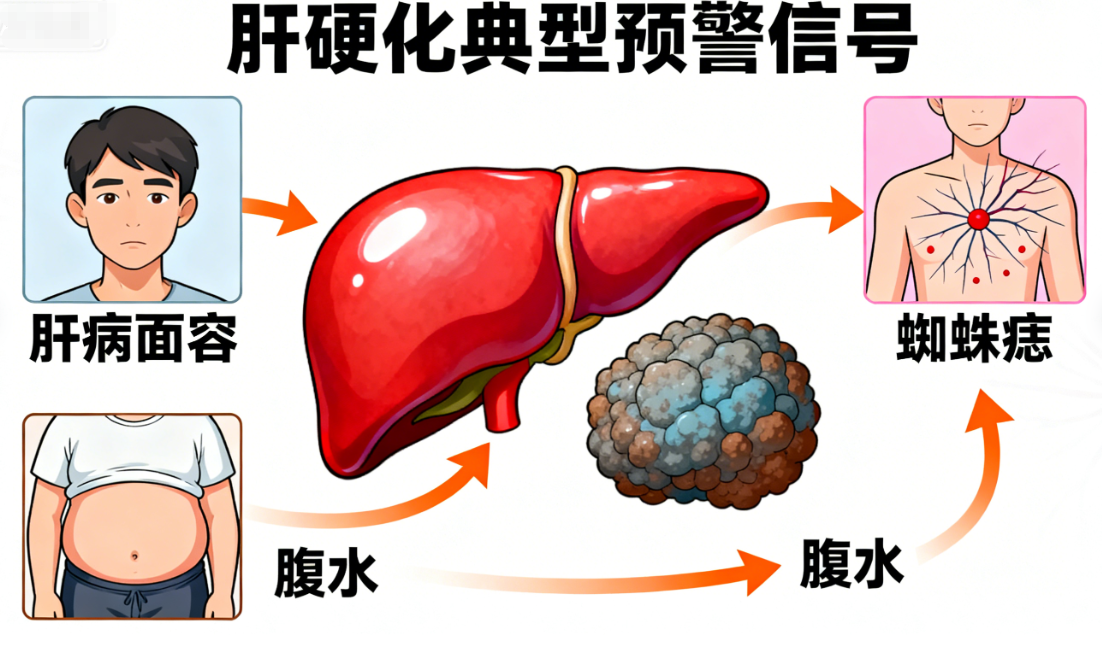警惕这些“预警信号”:早期可能只是乏力、食欲差、腹胀,很容易和胃病混淆;但出现“肝病面容”(面色晦暗、黑眼圈重)、蜘蛛痣(胸口、颈部小红点,按压褪色)、腹水(肚子突然变大,像装了水),就说明肝脏已经“硬”得很严重了。