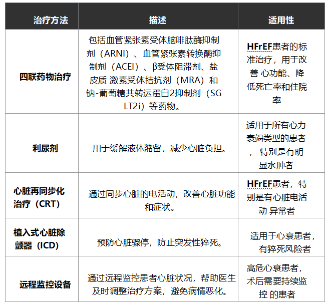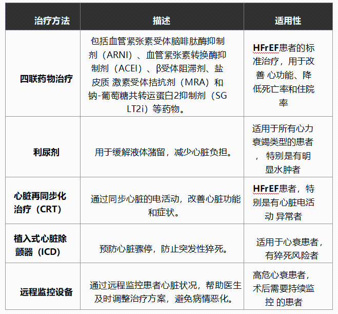 如果已经确诊心力衰竭,不用惊慌,积极治疗可以帮助你控制病情、改善症状。心衰治疗主要包括药物治疗、生活方式管理和器械治疗: