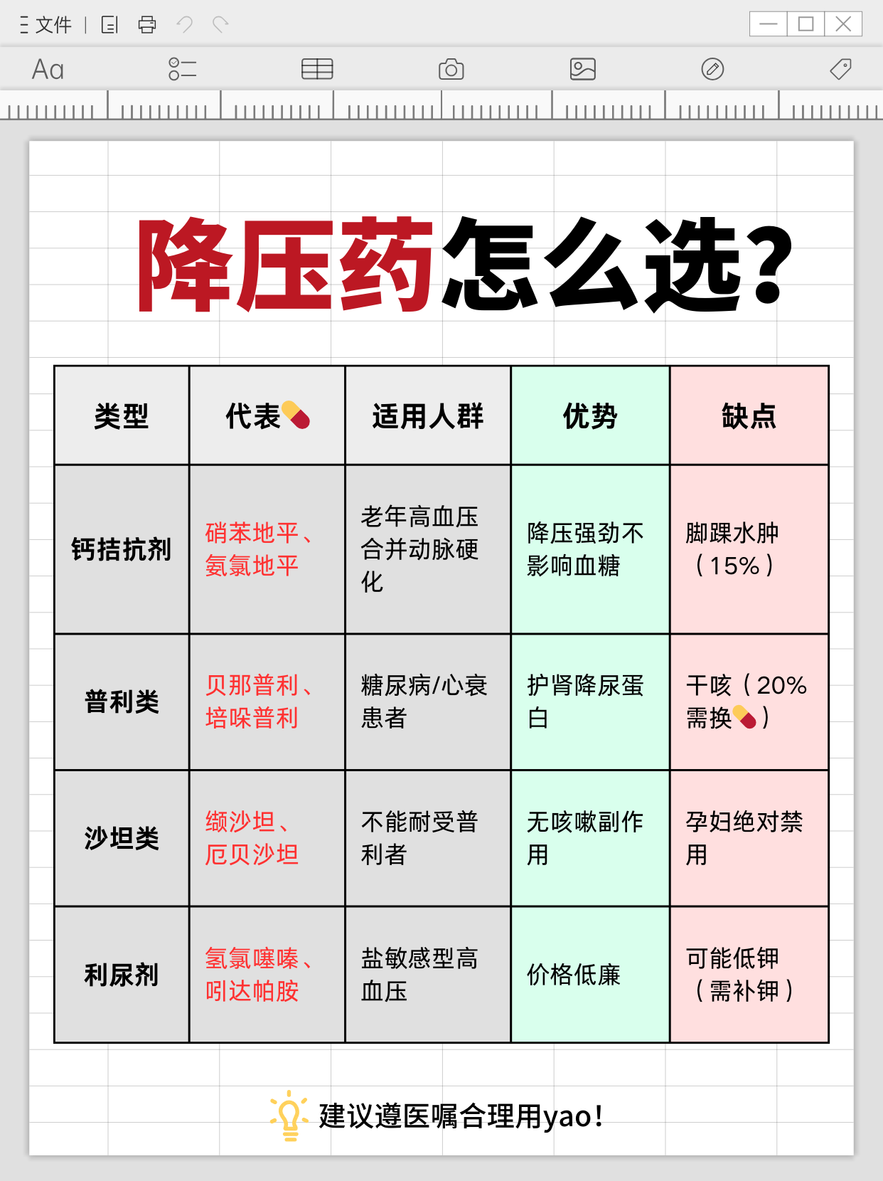 钙通道阻滞剂(CCB):适合老年高血压、动脉硬化者,可能引起下肢水肿。